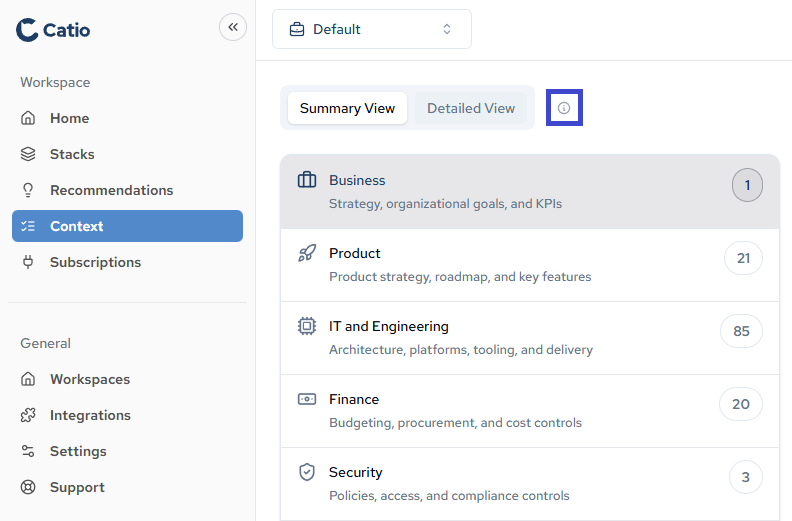 After uploading the file, context will then be available to view within the selected category. To drill down further, click on the Detailed View button. From there you can see the extracted context from the document as well as what categories Catio tagged it as.