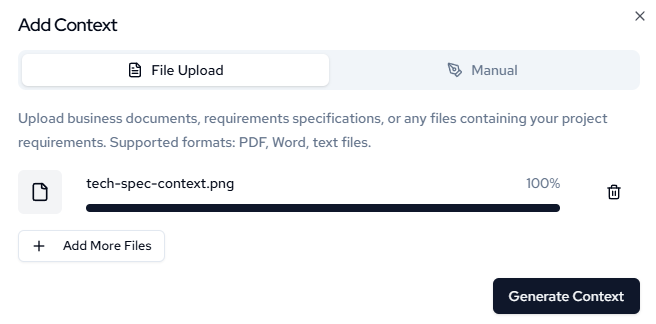 - Manual Upload: Navigate to the Context section in your workspace and upload documents directly by selecting the appropriate category.