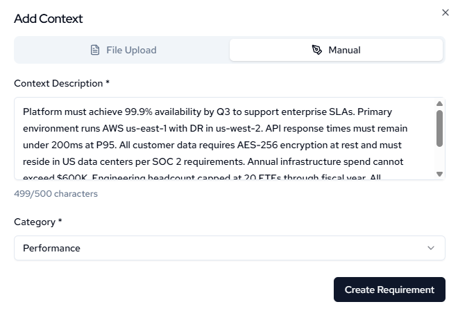 Without context, Catio has visibility into your architecture but lacks the criteria to evaluate it. Recommendations cannot be generated until at least one requirement is defined. The more specific and comprehensive your context, the more targeted and actionable your recommendations become.