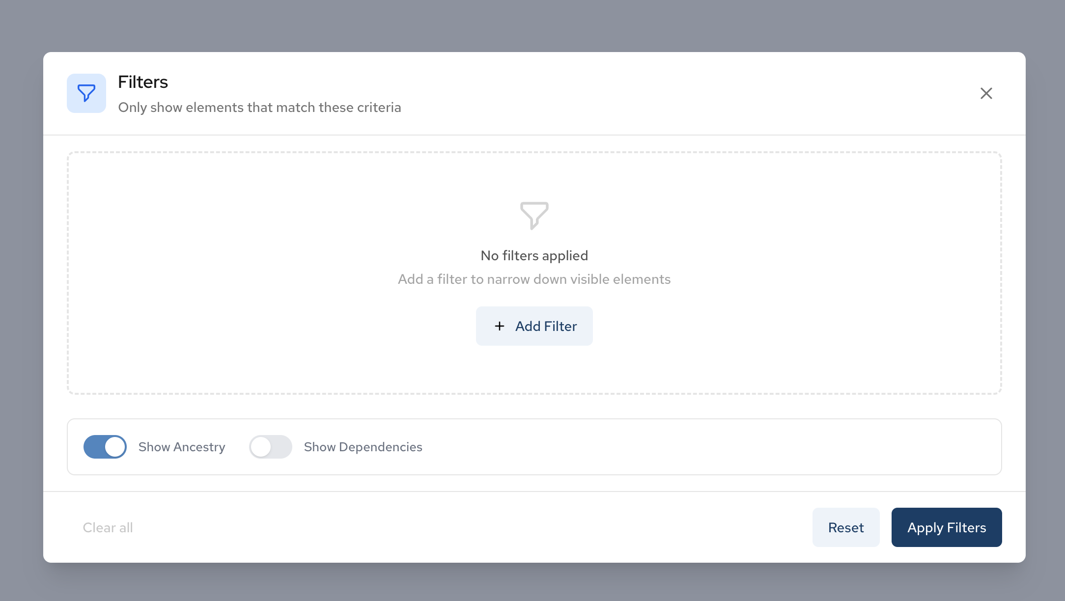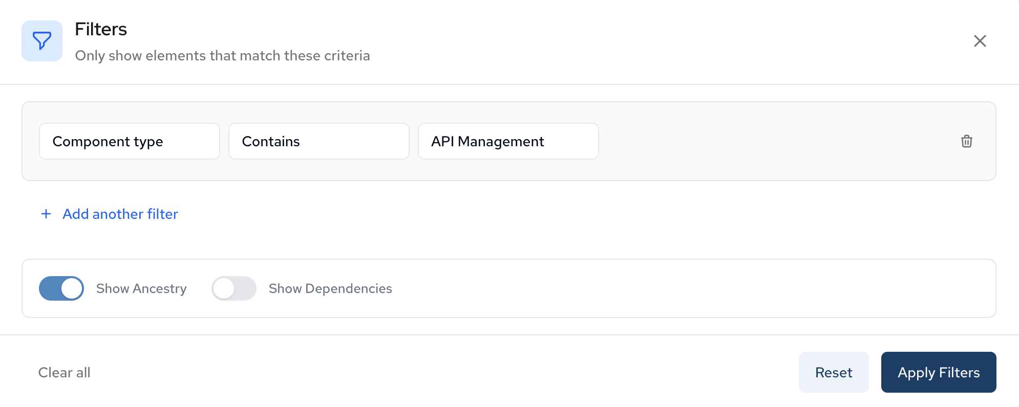 Use the filters to narrow down the components displayed in your diagram based on criteria such as component type, tags, or relationships.