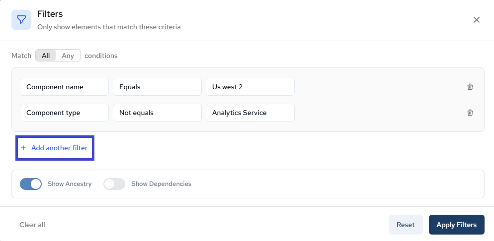 After clicking into the Filters panel, you can adjust existing filters or add new ones to refine the components displayed in your diagram.