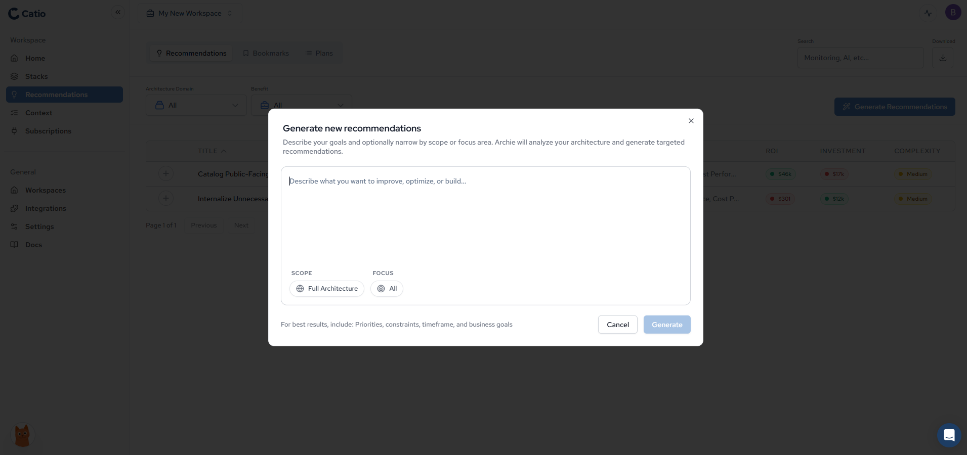 Recommendations are generated by describing your goals and letting Archie analyze your architecture against your business context. Before generating, make sure you have at least one active integration subscribed to your workspace and have added relevant context through Adding Context.