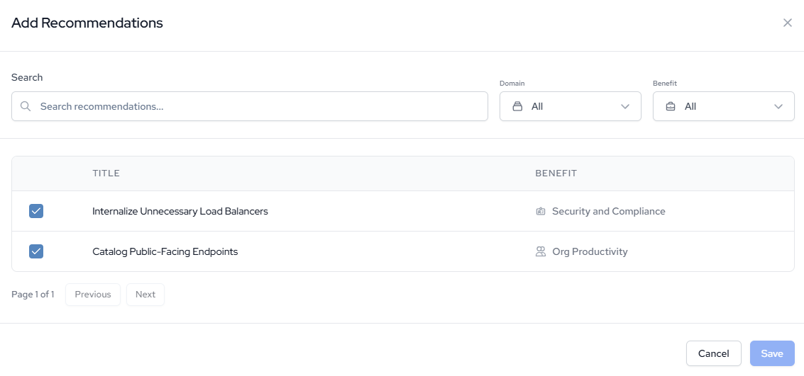 - Review and filter the recommendation list by domain or benefit to focus on your current planning cycle.