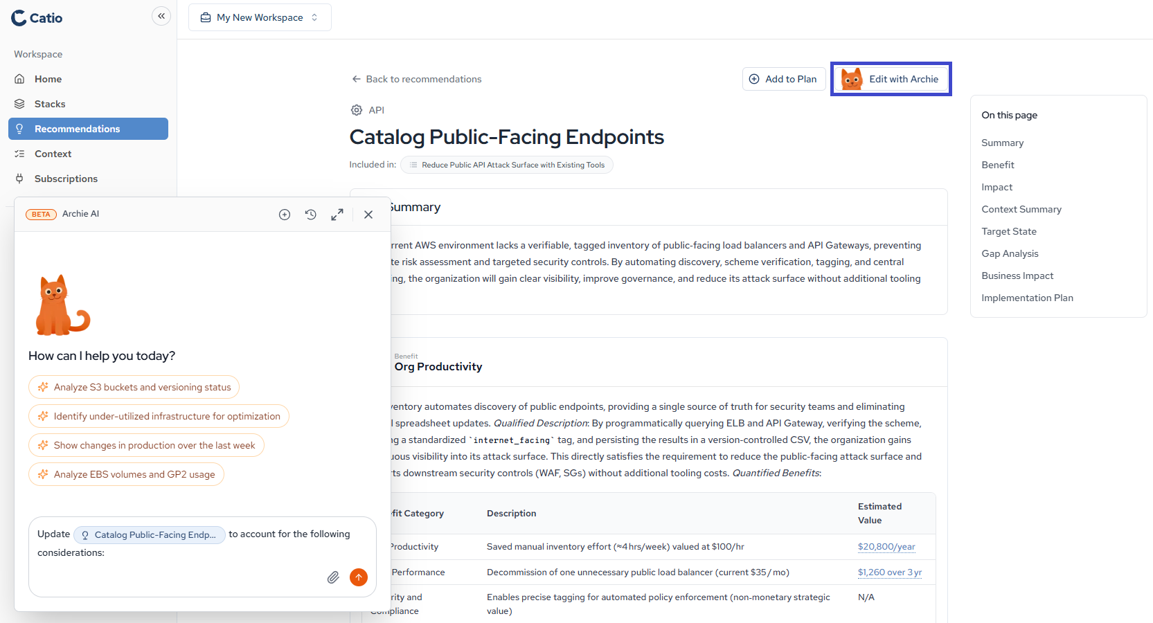 Archie will revise the recommendation in place based on your input. You can also use the suggested prompts Archie provides, such as analyzing specific resource types or identifying optimization opportunities.