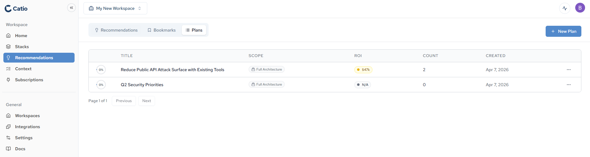 Navigate to the Plans tab to see all your plans. Each plan displays its Title, Scope, ROI, recommendation Count, and Created date.