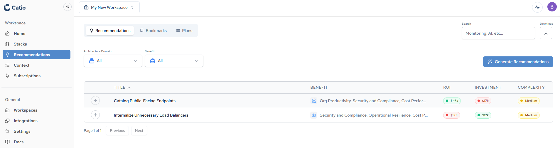 After generating recommendations, navigate to the Recommendations tab in the left sidebar. The recommendations list displays each recommendation with its Title, Benefit categories, ROI, Investment, and Complexity.