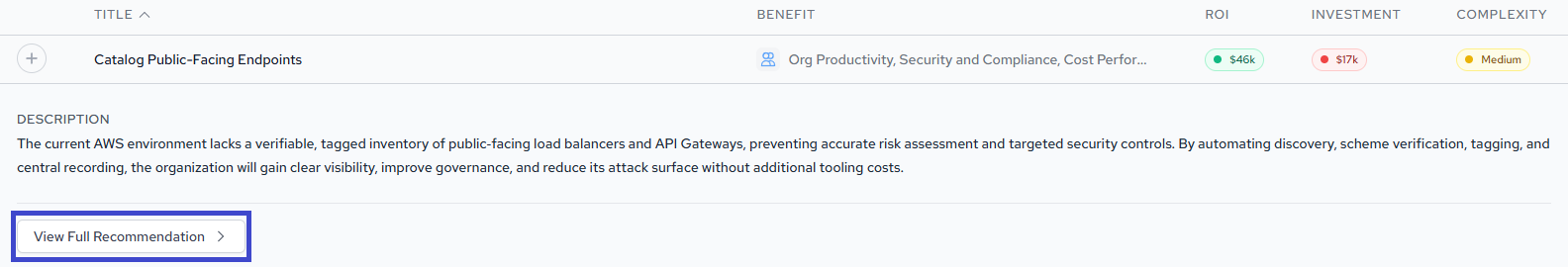 Click any recommendation row to expand it and view a short description of what the recommendation addresses. Click View Full Recommendation to open the full detail page.