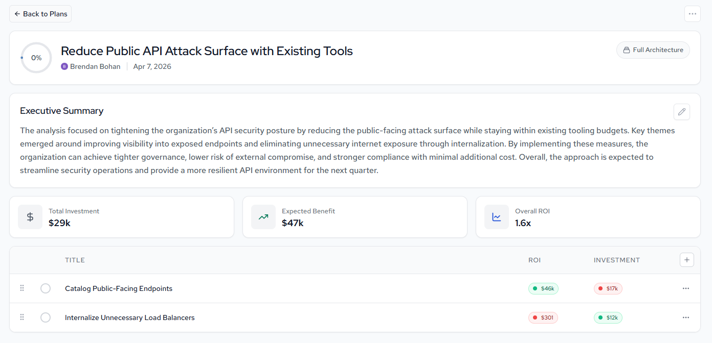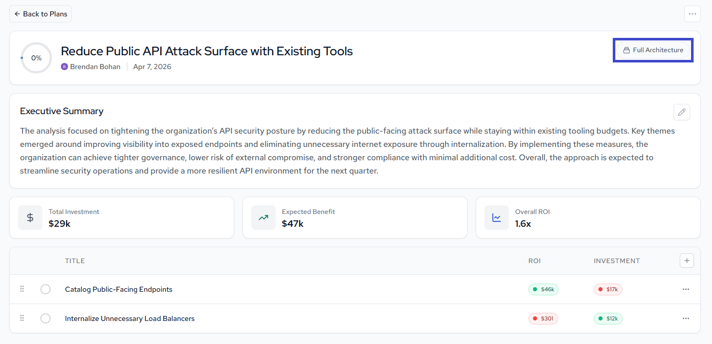 From any plan detail page, click Full Architecture in the top right to transition into Stacks, where you can see the full architectural context for the components addressed by the plan's recommendations.