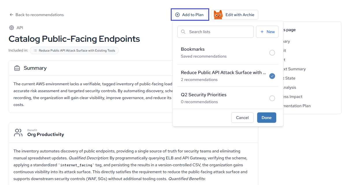 From the full recommendation page, click Add to Plan in the top right. A dropdown displays your existing plans and the option to select Bookmarks. Select the plan you want to add the recommendation to, then click Done.