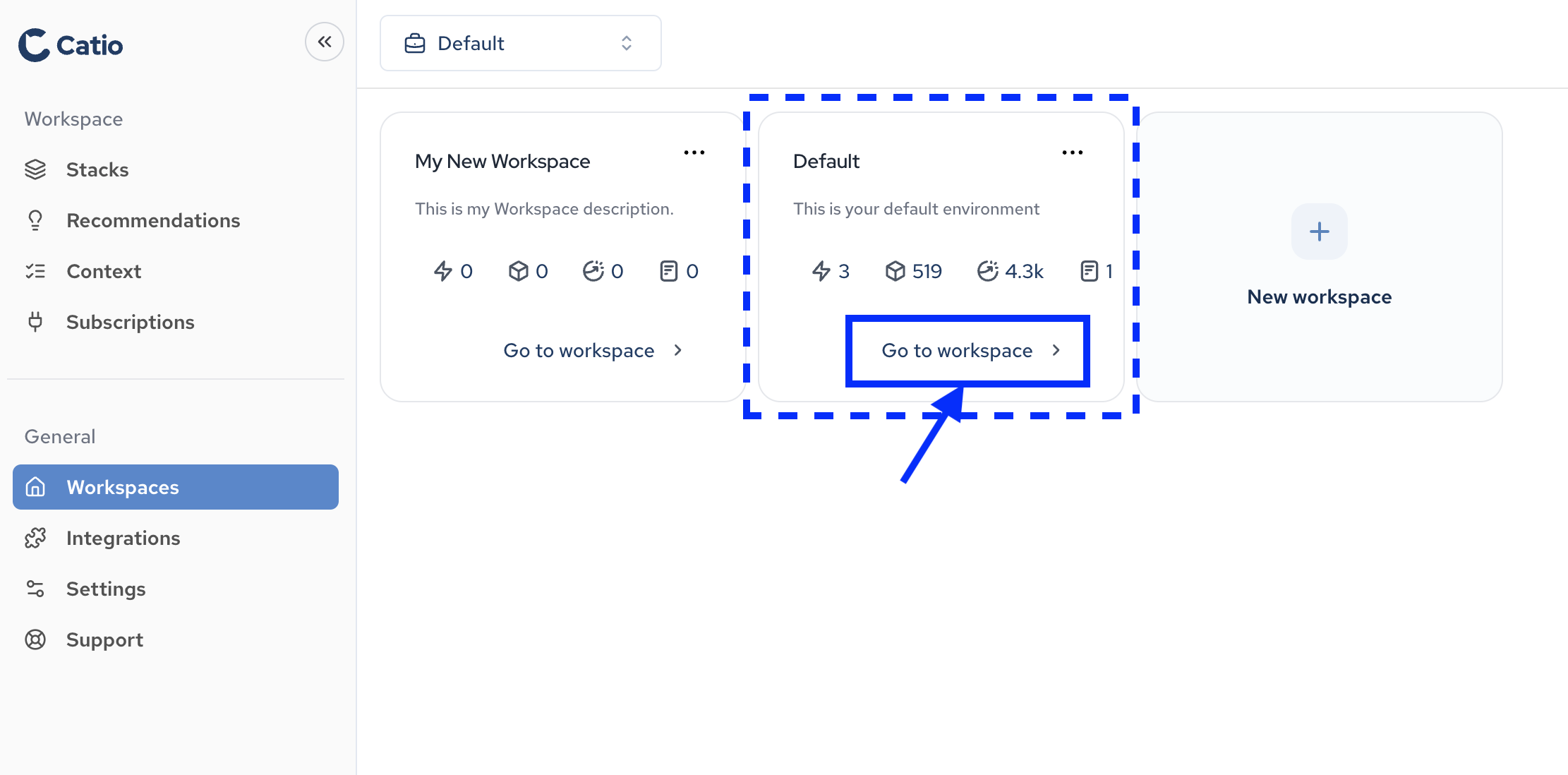 To open a workspace in Catio, you first need to navigate to the Workspaces main screen by clicking Workspaces (under General) in the left-side navigation. On this screen, you'll see all of your available workspaces.