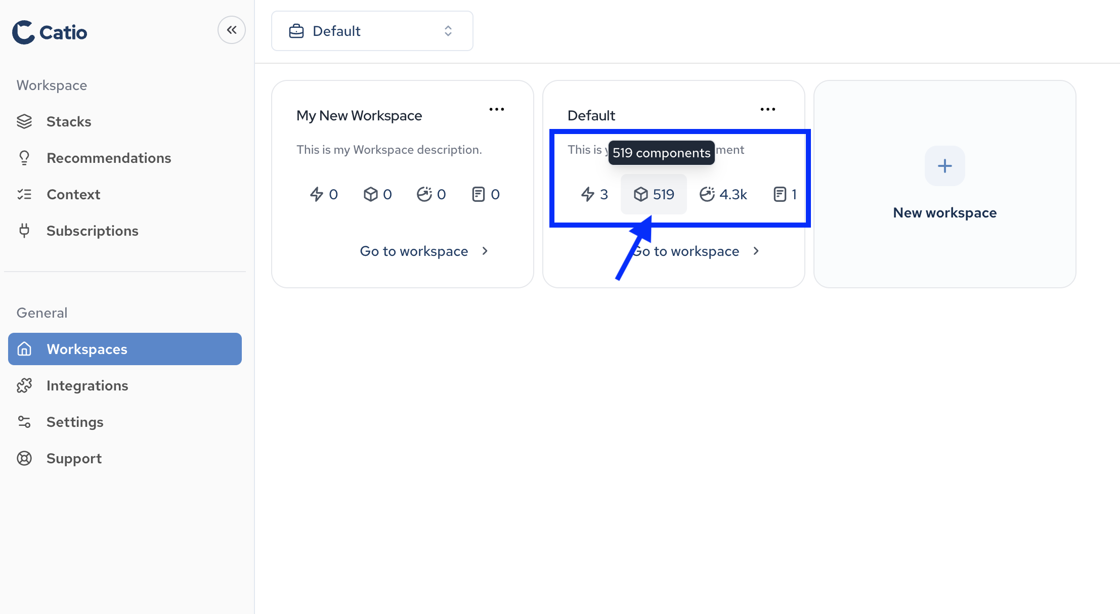 Alternatively, you can also go directly to specific areas of the workspace directly from the workspace entry as well. To do this, click on any of the four entries in the workspace entry, which will take you to the workspaces integrations, components, relationships, or documents (context).