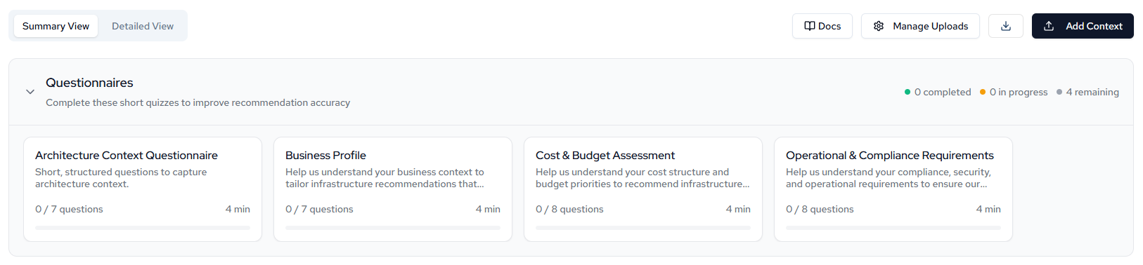 Questionnaires are short, structured quizzes that capture additional architecture context to improve recommendation accuracy.
