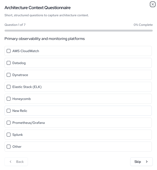 - Architecture Context Questionnaire: Captures core architecture context such as observability and monitoring platforms in use.