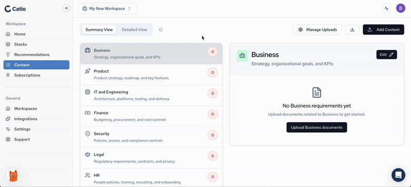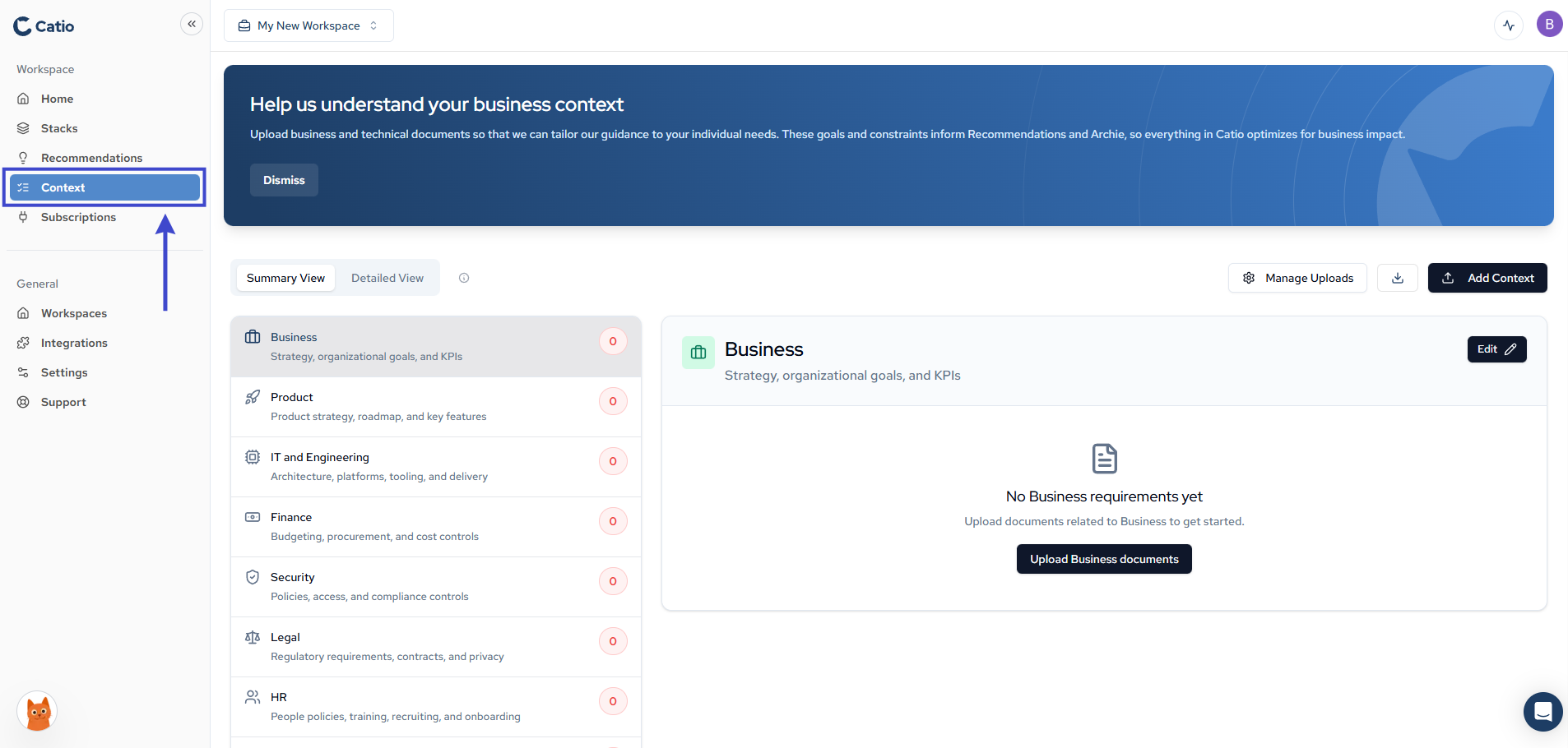 Upload business and technical documents to help Catio tailor guidance to your organization's specific needs. Context documents inform the Recommendations module, ensuring all architectural insights align with your business objectives and constraints.